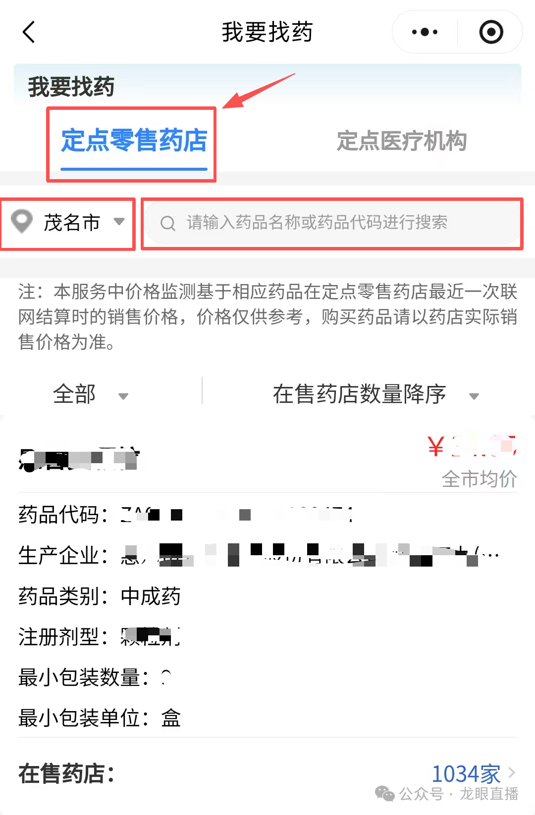 ③干与“我要找药”操作模块后,汲取茂名市,采用“定点零卖药店”;