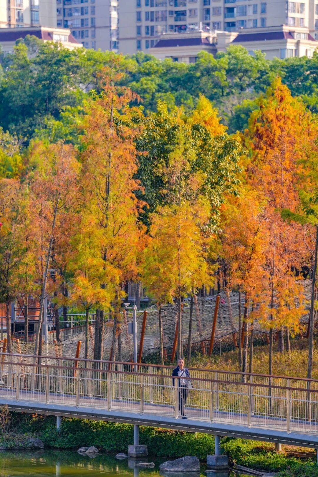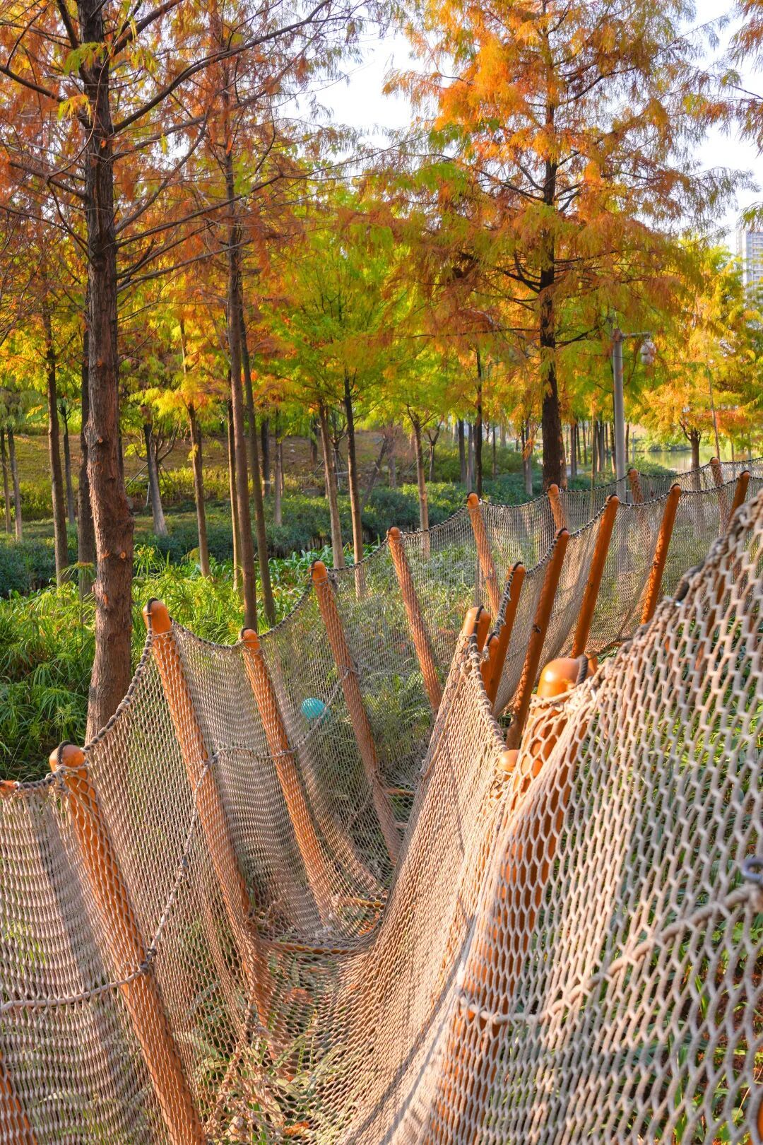 深入公园往前走,跨过连桥,等于好意思得让东谈主心醉的落羽杉林。