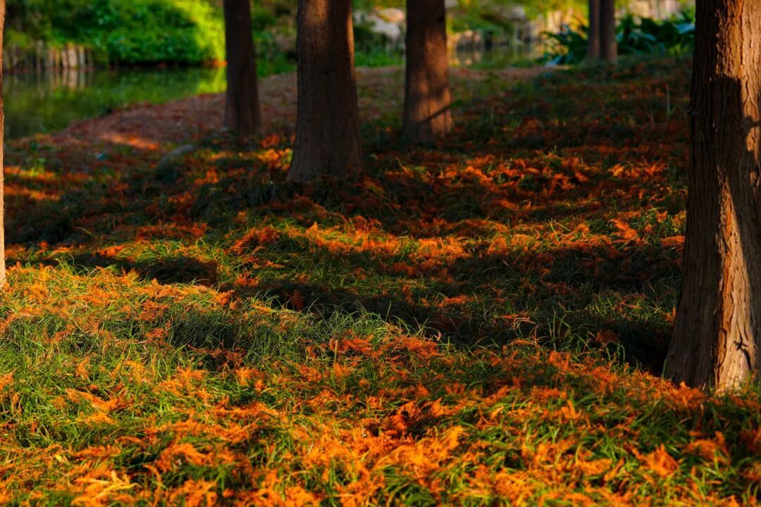 下昼的色泽最为轻柔,打卡拍照终点出片。当轻柔的阳光散落在红色的落羽杉上,与水光潋滟的湖面相互烘托,就是一幅绝好意思的油画。